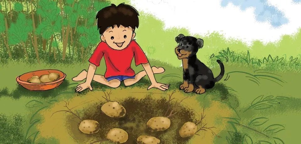 One day Maloo had to get some potates from his grandmother’s kitchen garden, but he could not find any. And then Kaloo helps him to uncover the hidden potatoes.