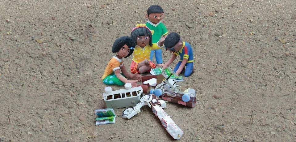 Four young boys and girls use bottles, old newspapers, and used books to create vehicles for their game. The game begins. They are driving carelessly. Suddenly, a CRASH!